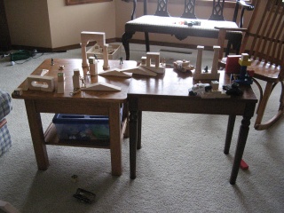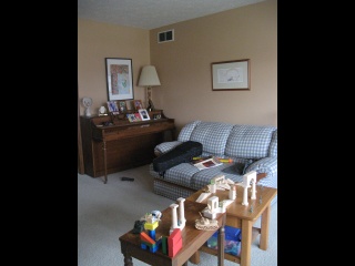 Lived In Living Room, March 2011. Blocks set up as a NERF dart firing range. Violin and music left on couch seat instead of tucked behind the love seat. NERF gun on the love seat.