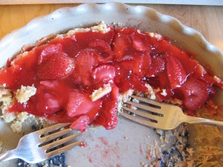 Love is cutting the last of the Strawberry Pie in half and then eating it directly from the pie pan with two forks. There is something special about Strawberry Pie. First of all, it is a gorgeous shade of RED. Secondly it is sweet, sweet, sweet and oh so delicious. When I was growin' up, each summer, our neighbor would give us one strawberry pie for my family of five to enjoy. One. After I was out of college, and on my own, I wrote to her and asked for the recipe. Her Strawberry Pie was one of those Memories from Childhood that stayed with me – like homemade ice cream on a summer day made in the backyard, chopping ice with a hammer and pouring salt around the whirring motor along with the ice. The best part was eating it at the picnic table under the shade trees before it melted in your bowl. But that's a memory for another day. Today Is All About The Pie.