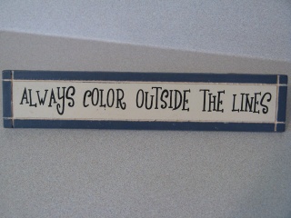 My mother is a firm believer in children making their own pictures on blank paper and not being confined to staying within the lines of a coloring page. How I love her for that philosophy even now. A few years ago my neighbor, who knows me well, gave me a sign that reads, “Always color outside the lines”. It sits in my kitchen where I see it everyday and smile a quick grin as I reread these beloved words. That philosophy still suits me best.