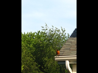 I took this picture of a robin perched on the neighbors rooftop after supper. I made some little slider burgers and we ate them on sliced Hawaiian sweet rolls because I'd forgotten to buy hamburger buns at the grocery store earlier that day. My husband was giving our oldest son a buzz cut on the deck in the backyard because his hair grows fast and it needed to be done. I'd gone outside to check on the progress of my garden. A small garden patch big enough for two rows of peas and eight tomato plants. On my way back in, I spied the robin next door. I quickly grabbed my camera from inside and was amazed he hadn't flown away but waited to pose and preen for me instead. Robin Red Breast. A sign of spring now past and rolling into the thick humidity that is summer in Illinois. A robin so beautiful in his brightly colored feathers and singing a melodious song. All the while reminding me of an early morning conversation with a friend that had begun the day, now ending.