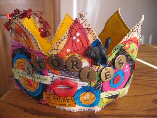 This spring, my mother introduced Kathryn Hall and I through Facebook. We'd met before that though, when I admired her artwork. I'd seen Kathryn's "Stories" and "Art Freak" crowns at Eclectic Gallery, in Jacksonville, Illinois, on a Thanksgiving visit home. I couldn't get them out of my mind or choose between them either. So I put BOTH of them on my birthday and Christmas Wish List that year…and Wishes Do Come True!