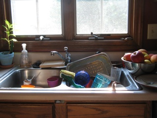 The day after Kathryn shared her poem with me, I returned home from taking my boys to school, and stopped by the kitchen sink for just a moment. I paused long enough to take a picture of the dirty dishes residing there, in the soft morning light, lookin' like a still life. Then I kept on walkin', to my favorite Writing Spot, and wrote, "lookin' for a rainbow" FIRST…and THEN I did the dishes.