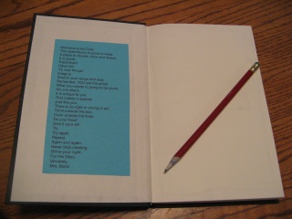 4. I'm sending you a Turquoise Tangles Sketchbook. Didn't have the chance to copy out the inscription for the front of it. So, dearest, here it is:Welcome to Art Club!This sketchbook is yours to keep.A place to doodle, draw and dream.It is yours.Experiment.Have fun!Try new things!Imagine.Stretch your wings and soar.Remember, YOU are the artist!What you create is going to be yours.No one elseโ€™s.It is unique to you.That makes it special.Just like you.There is no right or wrong in art.Think outside the box.Color outside the lines.Do your best!Give it your all!Try.Try again.Repeat.Again and again.Never stop creating.Shine your Light.For His Glory.