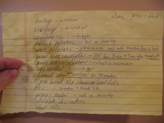 The third phone call of the morning was to consult with my mother on How To Make The Stuffing. I love my mother’s stuffing. LOVE. IT. SO. MUCH. Truly, her stuffing is my favorite part of the Thanksgiving Feast. She was cookin’ over 100 miles away yesterday, so I wasn’t goin’ to be sittin’ at her table. I saw her a few days ago though, and asked for her stuffing recipe. She said, well, I don’t really have one. Oh no! I am so not the kind of cook that can Wing It. These two words are really not in my vocabulary very often. I am so By The Book at times I bore myself. Though I’m gettin’ better at it. I am! She wrote some directions on a post-it note to help me out. A post-it note. I chopped, diced and sauteed and then called to find out whether to add the seasoning to the skillet or in the bowl. She said, “I add it in the skillet so the seasoning is more evenly distributed.” That’s was I was thinkin’ too, but was thankful for the confirmation. Done and done. The stuffing is all combined and the crock pot is turned on. Before we hung up my mom said, “I am so glad you called.” I agreed with, “Me too.”