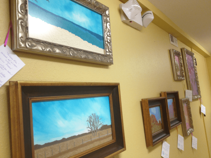December 14, 2011 Image Here is a look down the wall, standing near the inside of the store. The nails were already there, so I made do and rearranged until the sizes and colors of the artwork blended, in a pleasing way upon the wall in the back of the store. Share this: Share on X (Opens in new window) X Share on Facebook (Opens in new window) Facebook Like Loading... Related