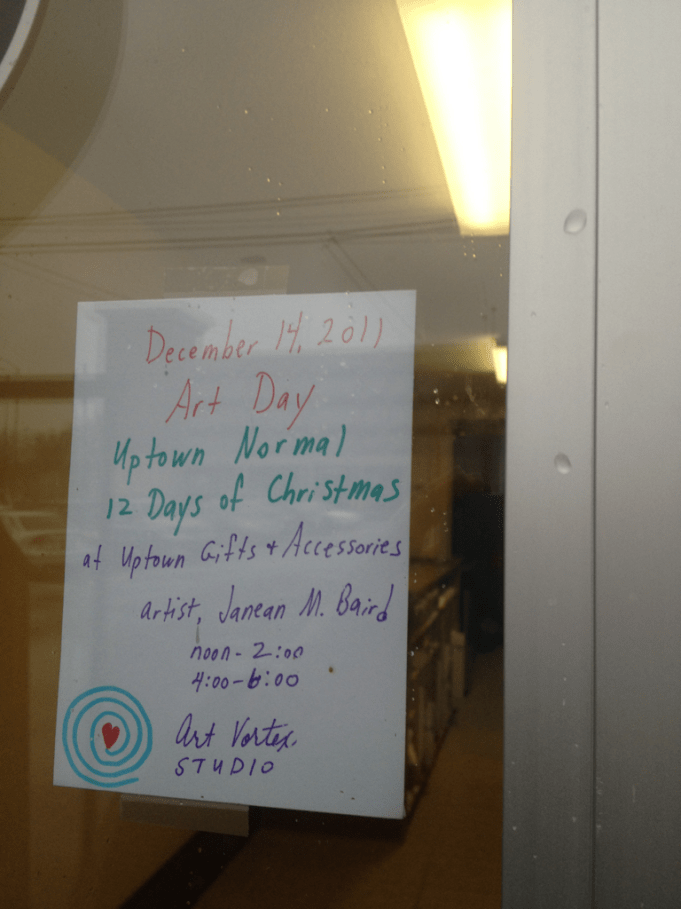 December 14, 2011 Image The sign I made for the front and back doors, announcing that I am The Artist In The House, at Uptown Gifts & Accessories today, for Art Day, in uptown Normal, Illinois. Share this: Share on X (Opens in new window) X Share on Facebook (Opens in new window) Facebook Like Loading... Related