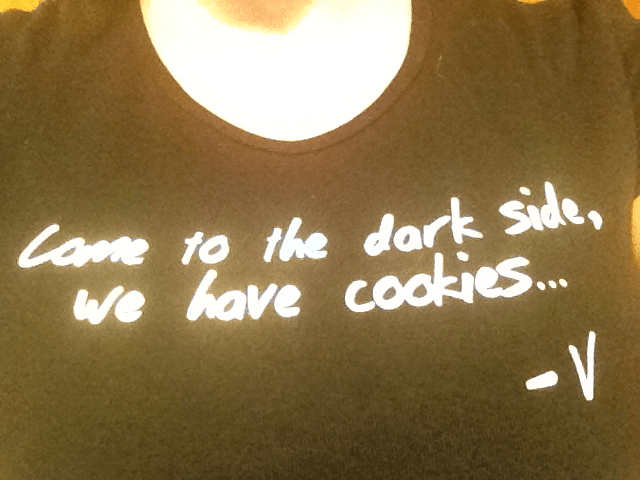 I am wearing my new Christmas t-shirt today, “Come to the dark side, we have cookies… ~ V” It makes me grin, especially since I usually identify more strongly with the Rebels, not the Empire. The Dark Side suits my surly mood today though, and I do LOVE cookies. What’s not to like?! ~ Janean