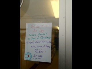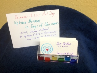 On the day of the Art Show I posted two notes on Facebook. The first, at 7:08 a.m. read, "I am so excited to be one of the artists participating in Art Day in Uptown Normal. I'll be at Uptown Gifts & Accessories from noon-2 and 4-6 today. Hope to see YOU there!" The second, posted just moments later on December 14, 2011 at 7:11 a.m. read, "Janean Baird has been busily making art the past few days to show at Art Day in Uptown Normal, which is TODAY! One more piece to finish…and frame…then settin' up this morning when they open. I will be at Uptown Gifts from noon-2 and 4-6 today. I didn't have a sign to put in the widow to say my art was there, so I'm posting it here instead."