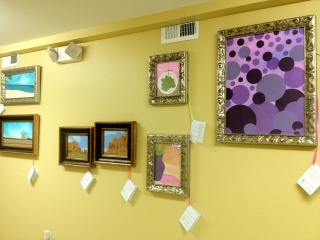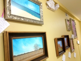Here is a look down the wall, standing near the inside of the store. The nails were already there, so I made do and rearranged until the sizes and colors of the artwork blended, in a pleasing way upon the wall in the back of the store.