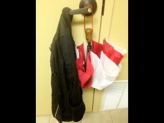 Here is my coat, hanging on the doorknob of the utility closet, next to my red and white State Farm umbrella. I had some visitors earlier in the day. They came by, just to see me and the art I've been making for the past three days. I worked on art making late into the night, began again in the wee hours of the morning, and during the in between time. It was worth it. So worth it. Mostly I am so thankful this opportunity didn't pass me by. Did I mention my name was in the paper today too? Yes, I feel like A ROCK STAR, for this snapshot moment of time, while my art is on the wall for a One Day Art Show in uptown Normal, Illinois.