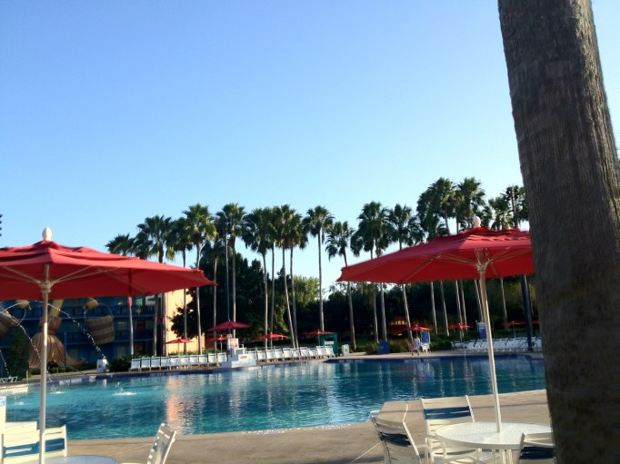 That evil, loud, serenity stealing, leaf blowing machine appears on the left of this photo. Of course, now it’s 8:01a.m. ET and the leaves must all be banished. I can hear the fountain hitting the pool once again. Ahh. Much better than that mechanical whir. Time to take my oatmeal, doctored up with brown sugar and cinnamon, along with my coffee refill, back to the room. Last day of vacation. The rest of my family assured me at bedtime they wanted to get an early start today. I’ll find out soon…