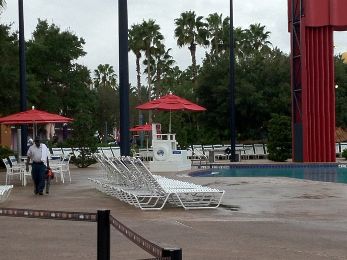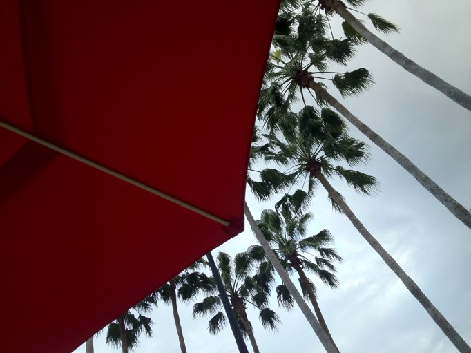 I sat down poolside with coffee only, just as a hint of drizzle turned to gentle rain at 6:20a.m. Thankful for that big red umbrella and time spent sitting in the dark outside. (It was quiet until that lady sat down with her cell phone…that she’s actually talking on and not typing on like me.)