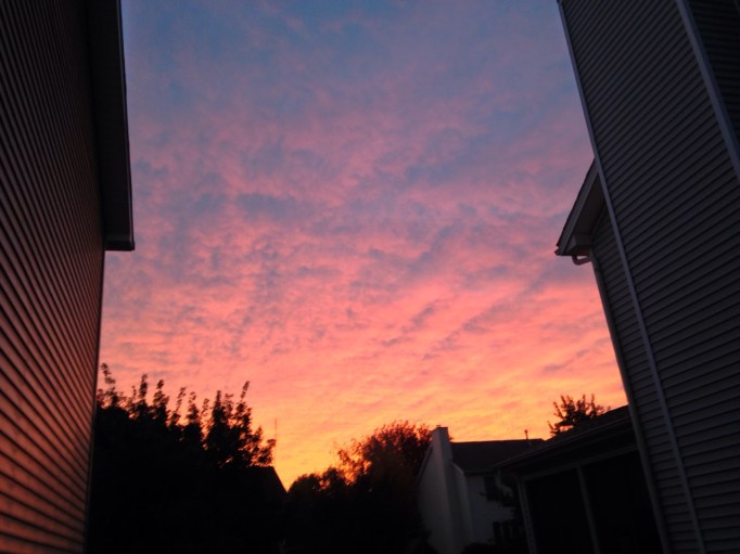 The sunrise is pink and purple today. The same colors as the batik leaf t-shirt I put on the dark. What a beautiful gift from God, this splash of gorgeous, rich colors across the morning sky.