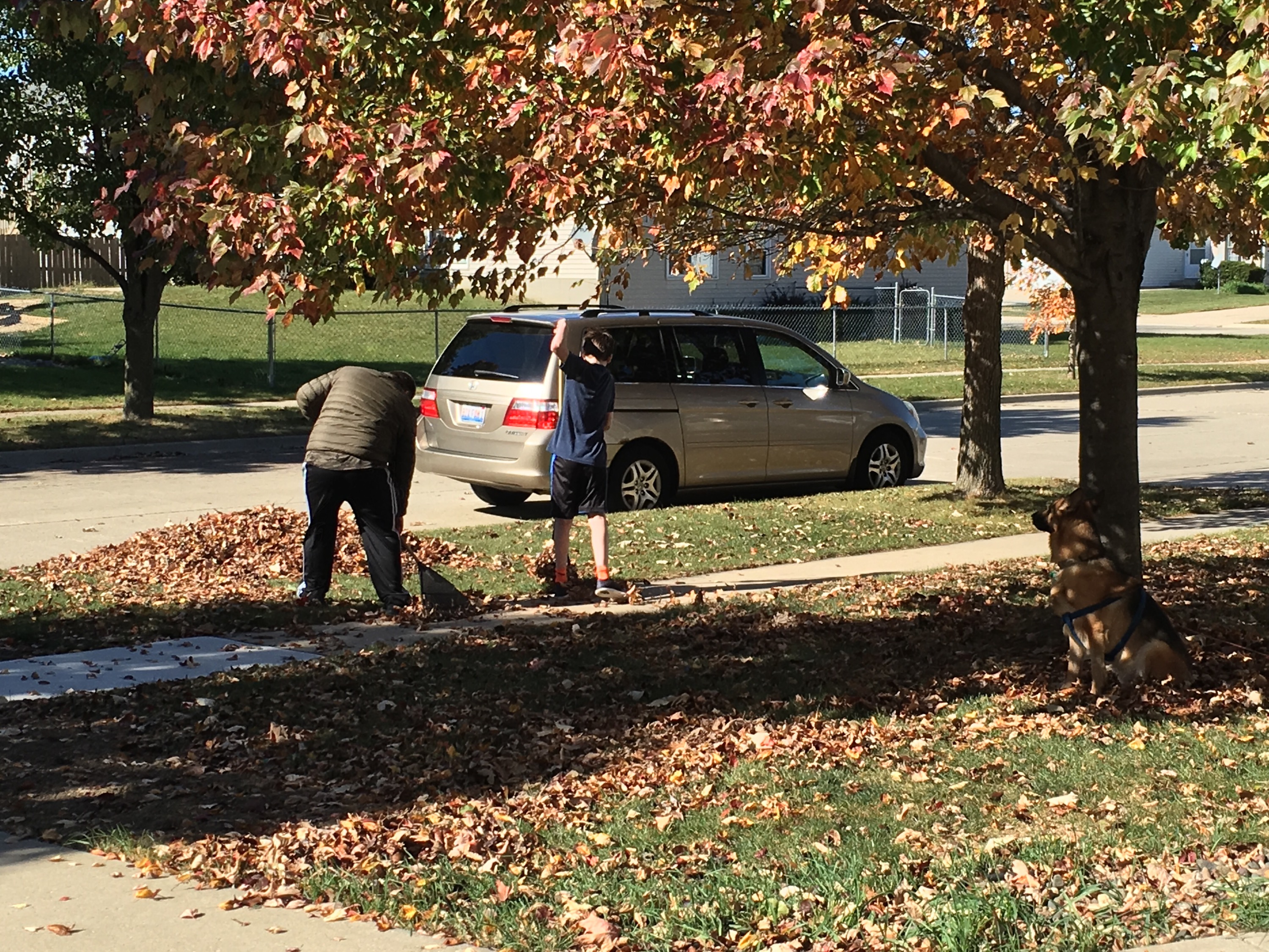 Good helpers. Blue supervising. Sneaky mom picture. Shhh don’t tell. They are front yard raking for chocolate cake I’m baking. Fair trade. I’d rather be raking with them than doing dishes.