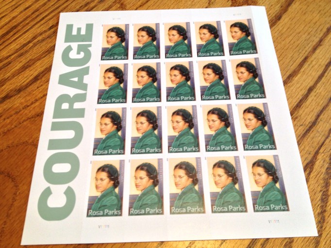 On Friday at the post office, I thought of my Grandma Thompson as I selected several sheets of “pretty stamps.” I chose Rosa Parks. Along the side reads in great big block letters, “COURAGE.” Quiet, strong, steady, resilient, tough, unwavering, standing tall, because she knew she was right, woman kind o’courage. Best of all, other than that initial confrontation, she didn’t stand alone.