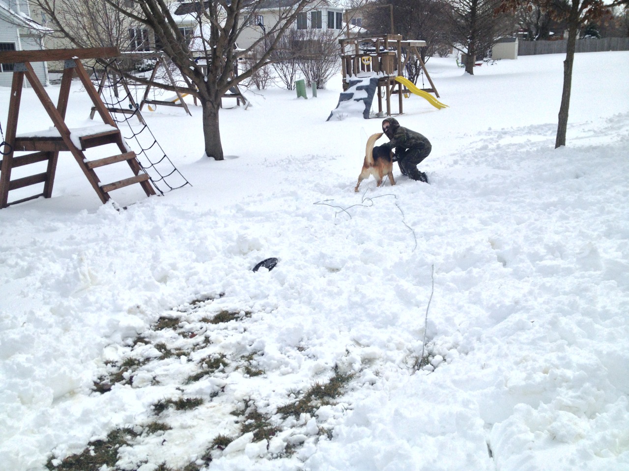 I am the crazy lady who shoveled her backyard to find the dog’s long leash, so he could romp and dance and play with his favorite 9 1/2 year old boy. It’s snowball throwing, snowman building, snowdog playing time. All is well.