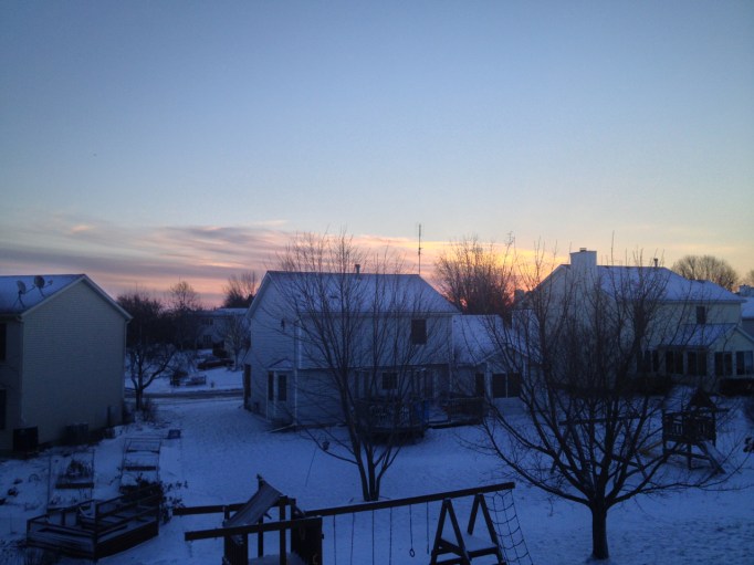 The first sunrise of 2014 was lavender and hot pink. Vivid, bright, streaks of pink, and me without my camera. Blue and I walked through the park. The only sounds his tags jingling, my cowgirl boot falls and one crow, but thankfully for just a l’il while. Shoo shoo. No cars. No joggers. Quiet, as the sky woke up with color. I didn’t look at the temperature before we set out. I looked at it just now: 17 degrees, feels like 2, and me without my scarf. Brisk, cold air and snow don’t bother me, though I’m not a fan of ice. I noticed we also have a winter storm advisory. OK. Sure. Whatever. I’m taking it as it comes, not fretting. Hello, 2014. I didn’t stay up to greet you at midnight, but I saw your first sunrise this morning, and it was as fabulous as the promise of this new year ahead. GOOD MORNING!
