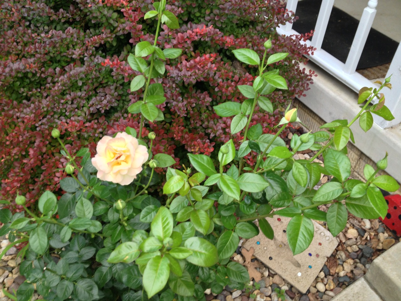 The peace rose planted by my front door has one bloom and sixteen buds. SIXTEEN! I can’t quite believe it! I chose this rose bush the first spring we lived here, way back in 2002, because the house I grew up in had a peace rose planted there. At my childhood home there were roses in an array of colors planted to the left of the front walk: red, coral, white, yellow, even a blue rose (really lavender), and peace. It was this peace rose, and its amazing beauty that comes in varying shades of yellow with white edges and a hint of pink blush, that was the only rose my dad commented on every time it bloomed.