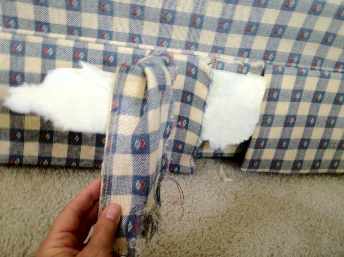 NOTE TO SELF: When the nine month old puppy is out of sight and quiet for too long DO NOT assume he is napping. Because when you ask your children, “Where’s Blue?” he may come trotting from around the corner, carrying a piece of couch upholstery in his mouth, grinning his wolf-like grin. So, I doused the couch in green apple spray and pushed it up against the bay window, shutting down his favorite hangout/barking spot in the center of the window. This is when I’m thankful the couch is from 1999. I think my usually sweet and charming pup has officially entered The Teenage Years. Lord help me!!!! Now he’s sprawled out ready for a morning nap. Grrrrrr That’s me growlin’, not the dog…maybe I need a morning nap too. ~ Janean