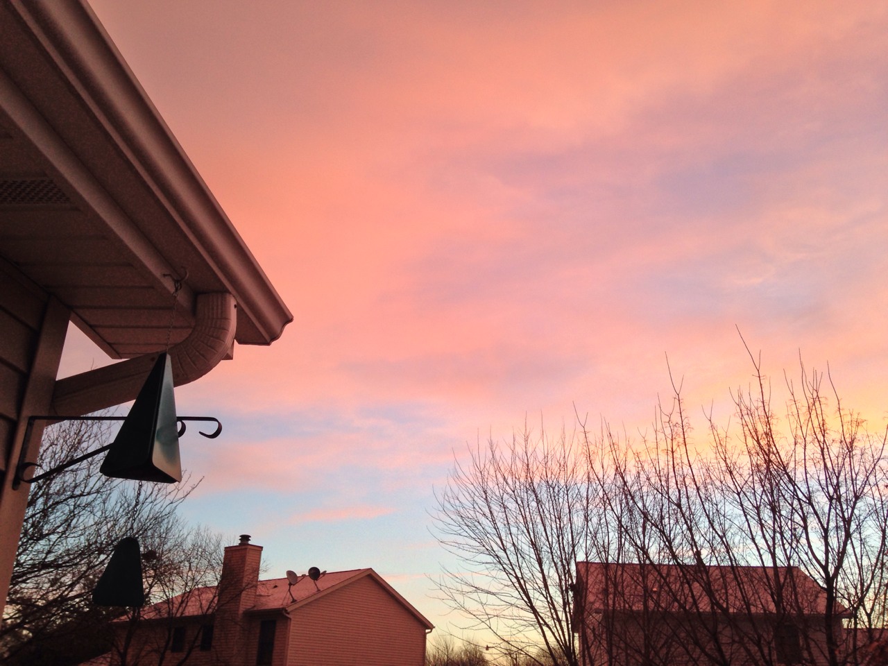 Blue and I saw the sunrise begin along the horizon. It was orange and gold then, as we circled ‘round the block and headed toward the park for the first time in weeks, due to cold and snow packed sidewalks. We both were missing our longer route. A few days ago he tugged that way, but I said, “No” and we took the shorter route to home. Today we ventured further once again. I was feeling ready and the dog was more than eager. “Let me at ‘em,” he said, with his nose down tracking. As we rounded the corner to the wide park path the glaze of ice was evident. Drat. Plan B was better. We walked in the grass. Diagonal even. A shortcut, “As the crow flies,” to quote an old expression. Blue looked at me with eyes that said, “Really?! You sure about this?! Fine by me, just checking.” That dog. I love him. Amber eyes that say so much. He didn’t woof, just trotted and stopped until I tugged. We made it home. Told boys, “Time to get up.” No one did immediately. Eventually they did. Before then though, a rose colored light caught my attention through the kitchen window. Oh. I opened the sliding glass door to the back deck. This. Pink clouds galore. Rose colored light. The essence of living life focusing on the Bright Side. Rose colored glasses. Except it was the whole sky casting rose light everywhere it touched. What a glorious way to begin a day. Today. I stood on the deck alone for just mere moments. Blue watched from the other side of the door, but greeted me as I walked back in to home. Good morning. I woke up hungry before 4am, but stayed in bed awhile longer. Morning whirl of dog walked, boys to school, now I can stop and breathe a second. Much better. Breakfast for me is next. Today is here. Embrace it.